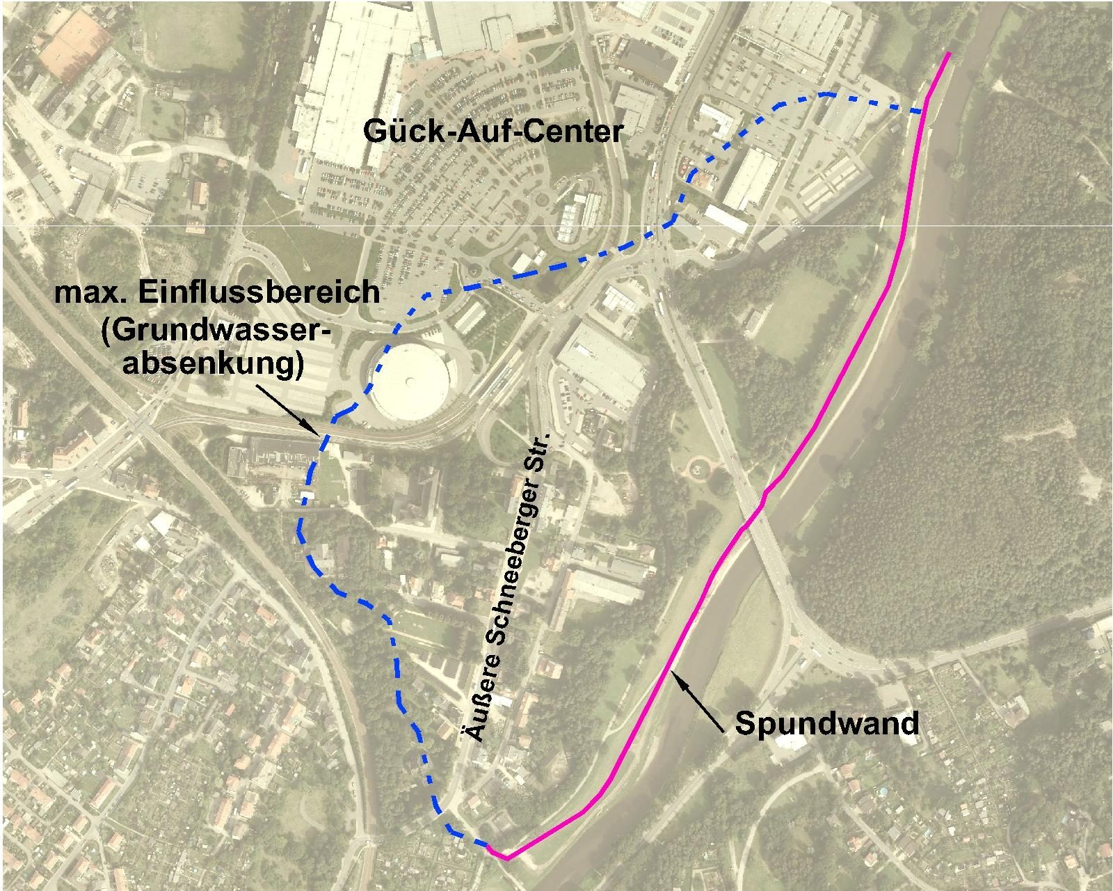 Zur Behebung dieser Verhältnisse und zur Schaffung dauerhaft stabiler Verhältnisse wurde durch den Freistaat Sachsen und die Wasserwerke Zwickau GmbH gemeinsam das Projekt „Sanierung der Siedlungsentwässerung und der Grundwasserhaltung im Bereich des Grundwasserdepressionstrichters Zwickau-Schedewitz" initiiert. Erster Schritt zur Realisierung ist dabei das Errichten einer unterirdischen Spundwand zwischen Mulde und Schedewitzer Senke.