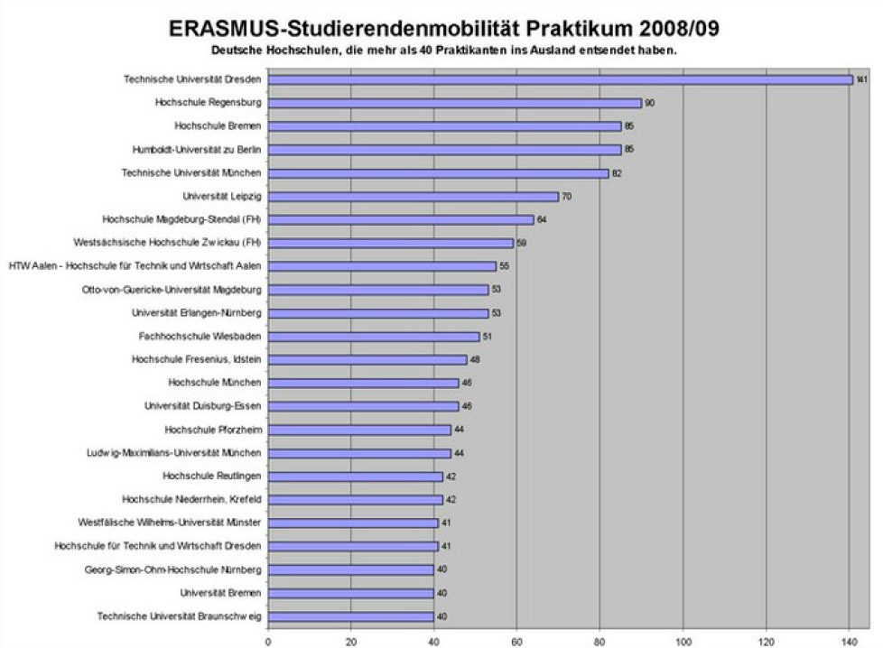 Die Westsächsische Hochschule Zwickau hat im Studienjahr 2008/09 knapp 60 Studenten als Praktikanten ins europäische Ausland vermittelt. Sie zählt damit zu den Top Ten der deutschen Hochschulen.