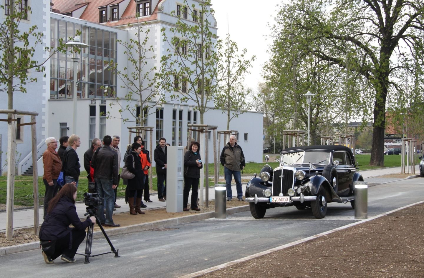 Passend zur Automobilstadt überfuhr als erstes Fahrzeug ein "Horch" die Poller - diese werden für Busse abgesenkt und verhindern unerlaubten Durchgangsverkehr.