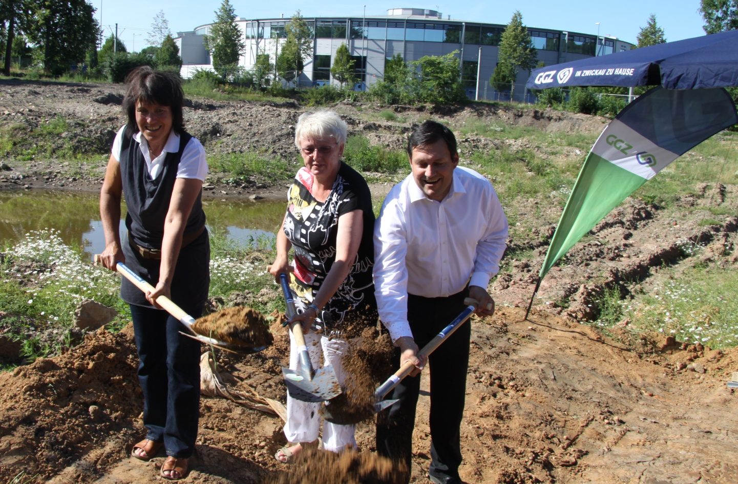 In Zwickau begannen gestern die Bauarbeiten für die neue Schwimmhalle. Gemeinsam mit Zwickaus Oberbürgermeisterin Dr. Pia Findeiß und Bert Hoffmann vom Planungsbüro Bauconzept Lichtenstein, setzte GGZ-Geschäftsführerin Jutta Giebner den symbolischen ersten Spatenstich.