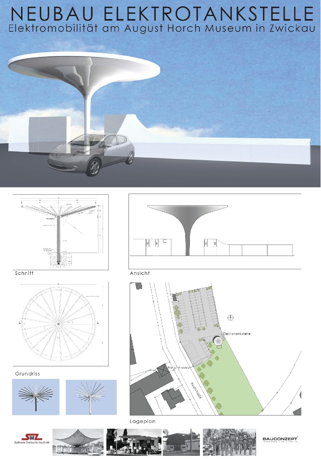 Die von der Bauconzept Planungsgesellschaft aus Lichtenstein konzipierte Solarstromtankstelle am August Horch Museum bildet dabei das Pilotprojekt Hier kann an vier Ladesäulen gleichzeitig Strom entnommen werden. Dabei kann eine Betankung mittels Lichtstrom (220 V) oder eine Schnellladung mit 400 V / 16A bzw. 32 A durchgeführt werden. Auf dem acht Meter im Durchmesser runden Dach der knapp 5 Meter hohen Konstruktion werden Solarzellen Strom zur Betankung liefern. Eine 10kWh fassende Batterie wird vor Ort in einem Keller als Speichermedium dienen. So ist es auch möglich, Strom aus lokaler regenerativer Erzeugung zu entnehmen, wenn aufgrund der Sonneneinstrahlung aktuell nicht ausreichend Energie zur Verfügung steht. Daneben ist die Tankstelle mit dem Stromnetz der Zwickauer Energieversorgung GmbH verbunden, so dass jederzeit ausreichend grüner Strom zur Verfügung steht. Damit potentielle Nutzer feststellen können, ob eine bestimmte Ladesäule verfügbar ist, erfolgt eine Anbindung der Ladepunkte an das Internet. Auch mittels mobiler Endgeräte wie z.B. Smartphones oder Tablett-PCs sollen Statusabfragen oder Reservierungen durchgeführt werden.