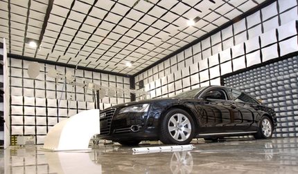 Bei dem Fahrzeuglabor zur Untersuchung der elektromagnetischen Verträglichkeit (EMV) handelt es sich um eine geschirmte, durch die Auskleidung mit Hochfrequenzabsorbern futuristisch anmutende Halle. Darin können moderne Fahrzeuge mit innovativen Elektroniksystemen hinsichtlich ihrer Immunität gegenüber elektromagnetischer Störenergie, wie sie beispielsweise in der Nähe von Rundfunk- und Mobilfunksendern auftritt, untersucht werden. Die Fahrzeuge werden auf einem in einer Drehscheibe integrierten Rollenprüfstand, der speziell für Elektroautos optimiert ist, unter realen Straßenbedingungen betrieben und mit Hilfe von Antennen bestrahlt. Zeitgleich werden die Fahrzeugfunktionen überwacht, um mögliche Schwachstellen der Elektroniksysteme analysieren zu können. Andererseits kann auch die elektromagnetische Emission von Kraftfahrzeugen ermittelt werden.