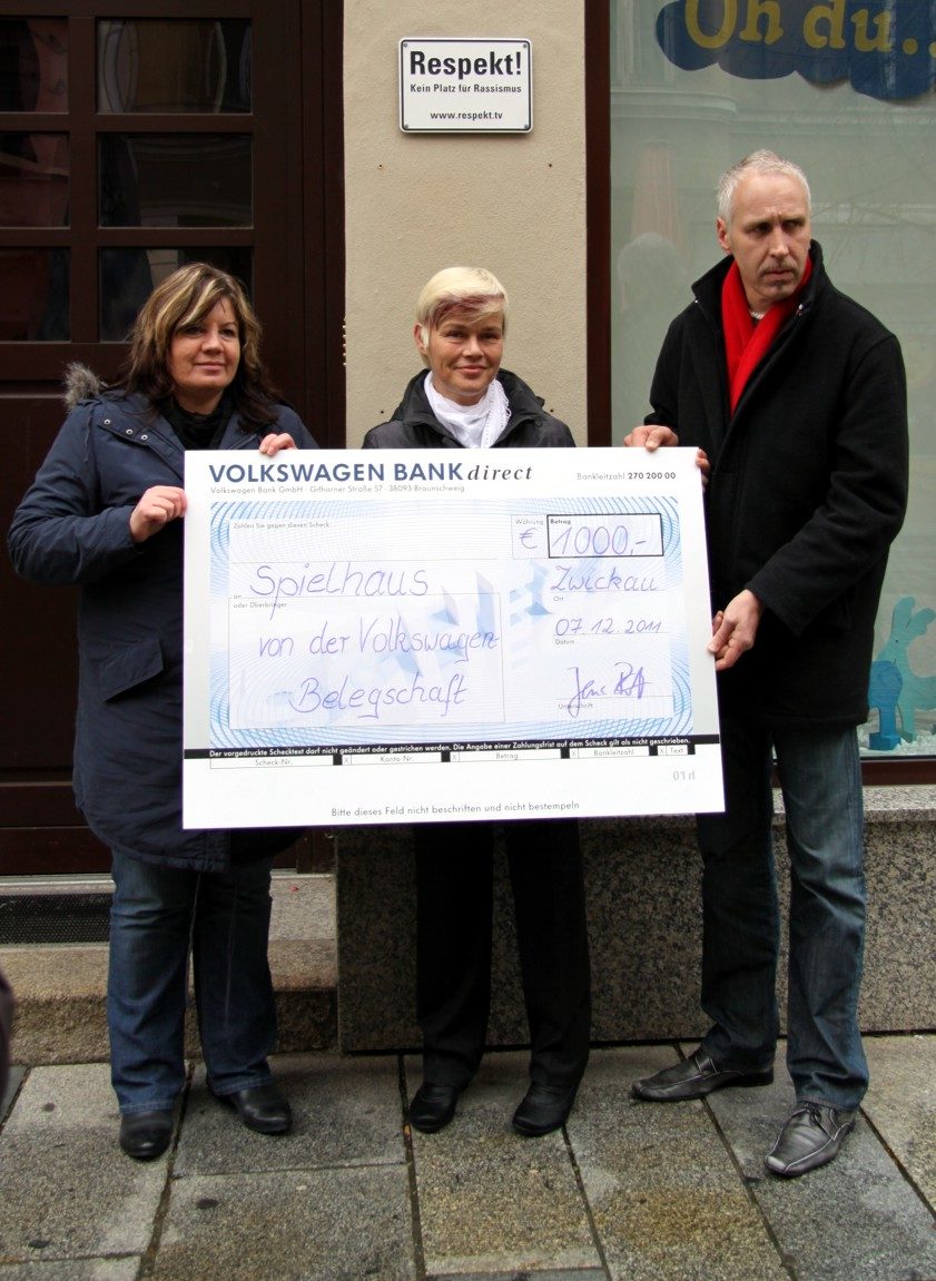 Der Betriebsrat beschloss, den Erlös durch den Pin-Verkauf aufzustocken. Mit Geldern der Restcent-Aktion der Belegschaft wurde eine vierstellige Summe daraus. Der Sozialausschuss des Betriebsrates der VW Sachsen GmbH entschied nach Prüfung eingereichter Projekte, das Geld der sozial-pädagogischen Arbeit der kommunalen Freizeiteinrichtung „Spielhaus" zukommen zu lassen. „Das Spielhaus wird überwiegend von Kindern besucht, die aus sozial schwachen Familien kommen und benachteiligt sind" berichtet Spielhaus-Leiterin Sylvia Schulze. „Mit unseren Angeboten möchten wir vor allem nachhaltige entwicklungsfördernde Erlebnisse und Eindrücke schaffen. Wir möchten Werte wie Anerkennung, Wertschätzung, Toleranz aber auch respektvollen Umgang mit Gleichaltrigen und Erwachsenen vermitteln und ihr Selbstwertgefühl stärken." Dank des Spendengeldes ist es nun möglich, erlebnisorientierte Spielhaus-Projekte umzusetzen und auch Kinderwünsche, wie z. B. eine Fahrt in den Leipziger Zoo oder eine schöne Weihnachtsfeier, zu erfüllen.