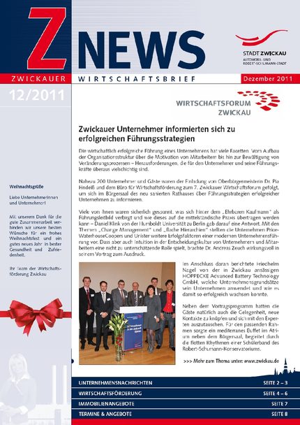 Der Rückblick auf das Wirtschaftsforum im November sowie die runden Jubiläen des Hagebaumarktes (20 Jahre), des Blumenfachgeschäftes Gellrich (100 Jahre) sowie des Juweliers A. Neubert & Sohn (125 Jahre!) gehören zu den Themen des neuen Wirtschaftsbriefes, der soeben erschienen ist. Weitere Beiträge beschäftigten sich mit neuen Videoclips, die für Zwickau werben, der erstmals übergebenen Praktikumsbox oder der Teilnahme an der Immobilienmesse Expo Real oder der „ZWIK". Die städtische Wirtschaftsförderung, die den Newsletter herausgibt, informiert zudem über die Messe „Zukunft hier!", die Woche des offenen Unternehmens, die im März 2012 stattfindet, oder den Einkaufs- und Gastroverführer, der im Frühjahr 2012 neu aufgelegt werden soll.