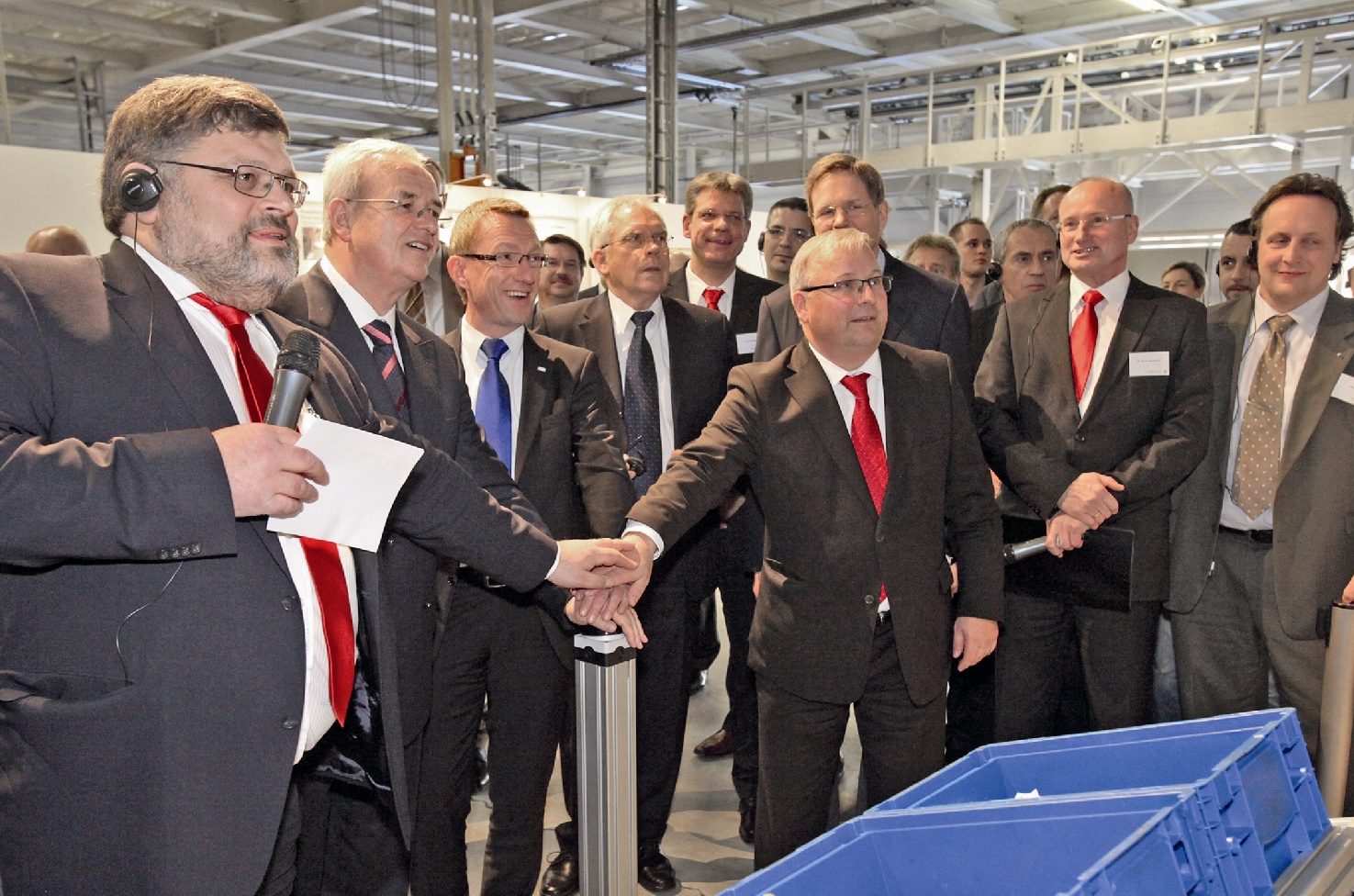 Positive Signale setzte das Standortsymposium, das gestern bei der Volkswagen Sachsen GmbH stattfand: 300.000 Fahrzeuge sollen künftig in Zwickau hergestellt werden, 2012 läuft der neue Karosseriebau an und ein Jahr später beginnt die Produktion des Golf Variant. Wie das Unternehmen mitteilt, diskutierten die Mitglieder des Volkswagen Konzern- und Markenvorstandes sowie des Aufsichtsrates von VW Sachsen bei dem Treffen mit dem lokalen Management sowie den Betriebsräten über strategische Handlungsfelder. Prof. Dr. Martin Winterkorn, Vorstandsvorsitzender der Volkswagen Aktiengesellschaft, nahm zudem den neuen Karosseriebau für Fahrzeuge auf Basis des Modularen Querbaukastens (MQB) in Betrieb.