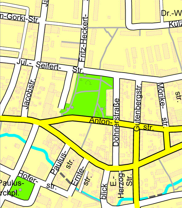 Bereits 1923 entstand auf dem heutigen Gelände des Stadtteilparks ein Turn- und Spielplatz für die „Jungmannen", die diesen ausgiebig zum Fußballspielen nutzten. Nach 1927 wurde das gesamte Areal nach und nach gestaltet. Es folgten in nördlicher Richtung ein Ruheplatz, ein Mädchengarten mit Blumenbeeten und Obstbäumen und eine Schrebergartenkolonie für die Gemeindemitglieder. Um in den Nachkriegsjahren der Nahrungsmittelknappheit entgegen zu wirken, gab die Kirche die öffentlichen Anlagen des Stadtparks zusehends als Grabeland frei, so dass wenig von dem Parkcharakter erhalten blieb. Die Pläne der Stadt, große Teile des Grünzuges mit Wohnungen zu bebauen, bedeuteten das Ende des „Paulusparkes", wie die Anlage von den Einwohnern genannt wurde. Ab 1958 wurden die Schrebergärten nach und nach aufgelöst und an anderer Stelle wieder angesiedelt. Der ehemalige Turn- und Sportplatz erhielt sein heutiges Aussehen in den 70er Jahren. Damals überarbeiteten ihn Freiwillige des Reichbahn-Ausbesserungs-Werks. Sie bauten die Straße zu ihrem Klubhaus aus, errichteten Parkplätze für die Nutzer der Kegelbahn und legten den Park neu an.