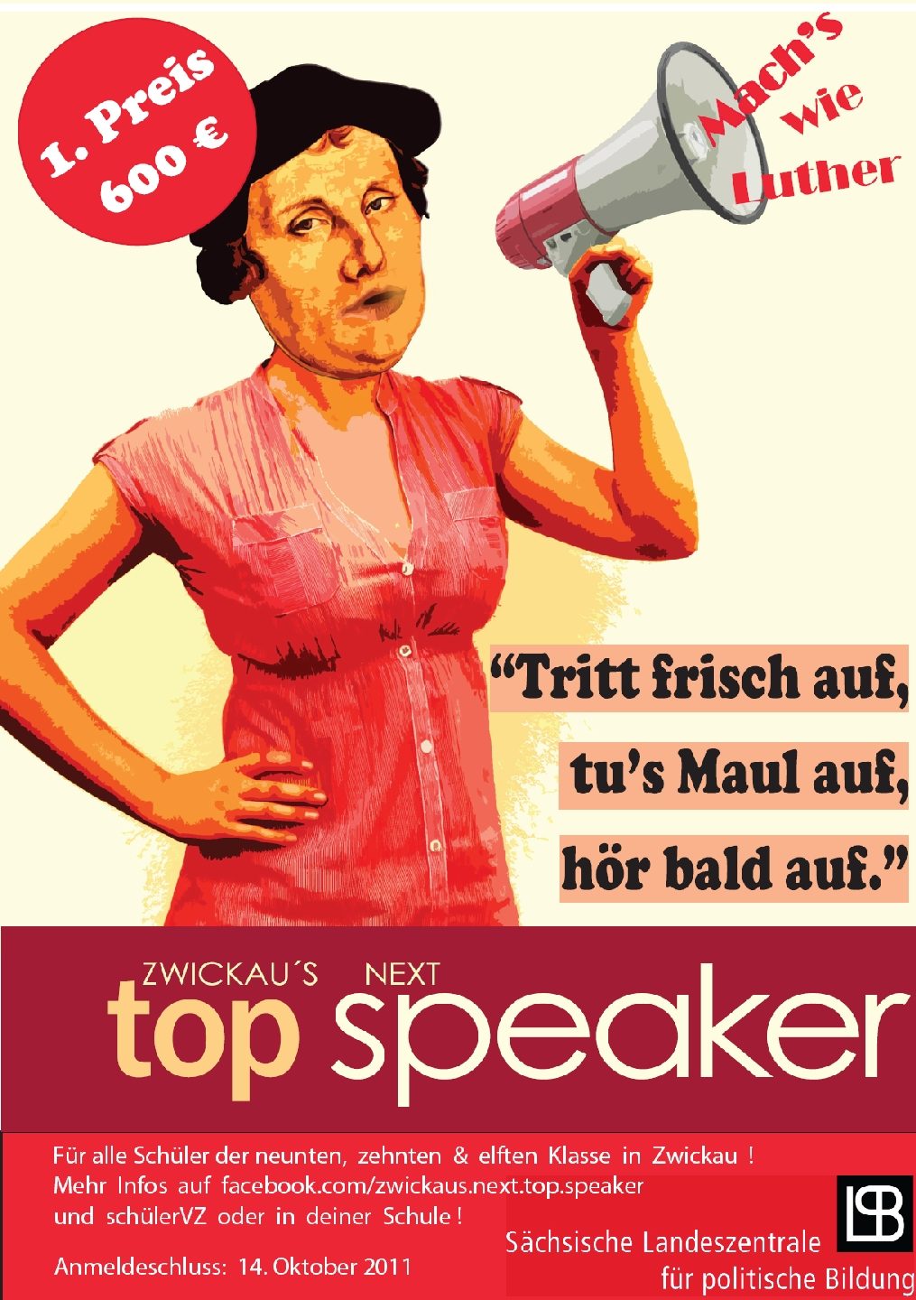 „Tritt frisch auf, tu's Maul auf, hör bald auf." Dieser Tipp stammt von Martin Luther, dem wortgewaltigen Reformator. Er wusste, wovon er sprach, und er hielt sich wahrscheinlich auch selbst daran, als er im Frühling 1522 vier Mal zu den Zwickauer Bürgern sprach. In den Wirren der Reformation war es zu Unruhen gekommen. Luther sollte mit kräftigen Worten wieder für Frieden sorgen. Fast fünf Jahrhunderte später hatte die Sächsische Landeszentrale für politische Bildung junge Zwickauer aufgerufen, dem Vorbild Luthers zu folgen und sich mit klaren Worten zu aktuellen oder brisanten Themen öffentlich zu äußern. 18 Zwickauer Schülerinnen und Schüler folgten diesem Aufruf.