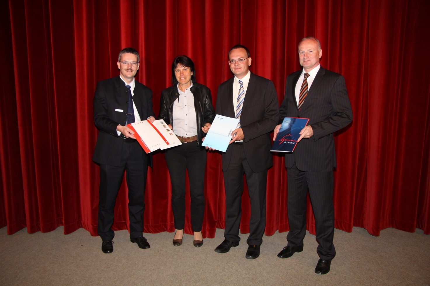 Felix Angermann (Sparkasse Zwickau), Reginald Fuchs (enviaM) und Dr. Gunter Sandmann (Volkswagen Sachsen GmbH) übergeben an Oberbürgermeisterin Dr. Pia Findeiß die Förder- und Sponsorenverträge.