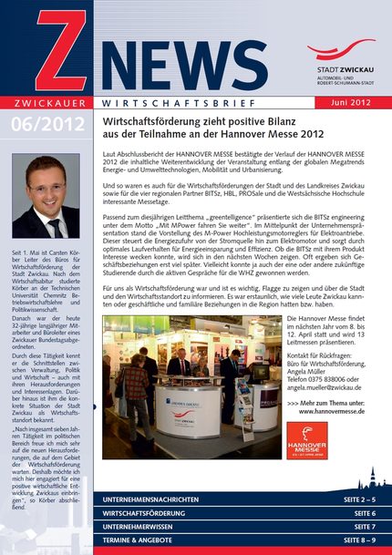 Am Standort Zwickau bewegt sich vieles. Abzulesen ist dies auch an der soeben erschienenen Ausgabe des Wirtschaftsbriefes, der mit neun Seiten umfangreicher ausfällt als gewohnt. Der Rückblick auf die erfolgreiche Teilnahme der städtischen Wirtschaftsförderung an der Hannovermesse oder auf die Übergabe des Gebäudes für Produktionstechnik stehen ebenso im Focus wie das neue Kompetenzzentrum „Elektrische Antriebskomponenten" oder das erst vor wenigen Tagen gegründete Institut für leichte elektrische Antriebe und Generatoren (ILEAG) e.V.