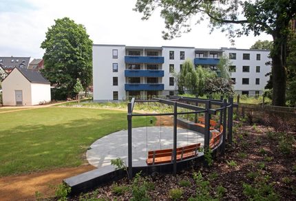 Der Wohnkomplex verfügt über eine Sozialstation des Arbeiter Samariter Bundes mit Küche, Pflegebad und Gemeinschaftsräumen. Die häusliche Pflege kann somit entsprechend der Bedürfnisse der Bewohner abgedeckt werden. Die Drei- und Zweiraumwohnungen in neun unterschiedlichen Grundrissvarianten sind mit Balkon/Loggia oder Terrasse ausgestattet, der Zugang ist über einen Personenaufzug und innenliegende Laubengänge möglich.