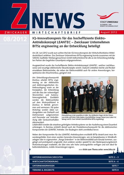 Pünktlich mit Beginn des Monats August erschien der neue Wirtschaftsbrief. In der Ausgabe 08/2012 informiert die städtische Wirtschaftsförderung über das Unternehmen BITSz engineering, das für sein innovatives Elektro-Antriebskonzept LEANTEC mit dem IQ-Innovationspreis der Wirtschaftsinitiative Mitteldeutschland ausgezeichnet wurden. Die Firmennachrichten beschäftigen sich auch mit der Fahrzeug-Entwicklung Sachsen (FES), Feinkost Dreißig oder der DPFA-Akademiegruppe. Weitere Themen sind beispielsweise der „ZWIK-Messestarter 2012", die EXPO Real oder die Unternehmensbefragung zur Breitbandversorgung. Informationen zum sächsischen BID-Gesetz und Veranstaltungshinweise runden den Newsletter ab.