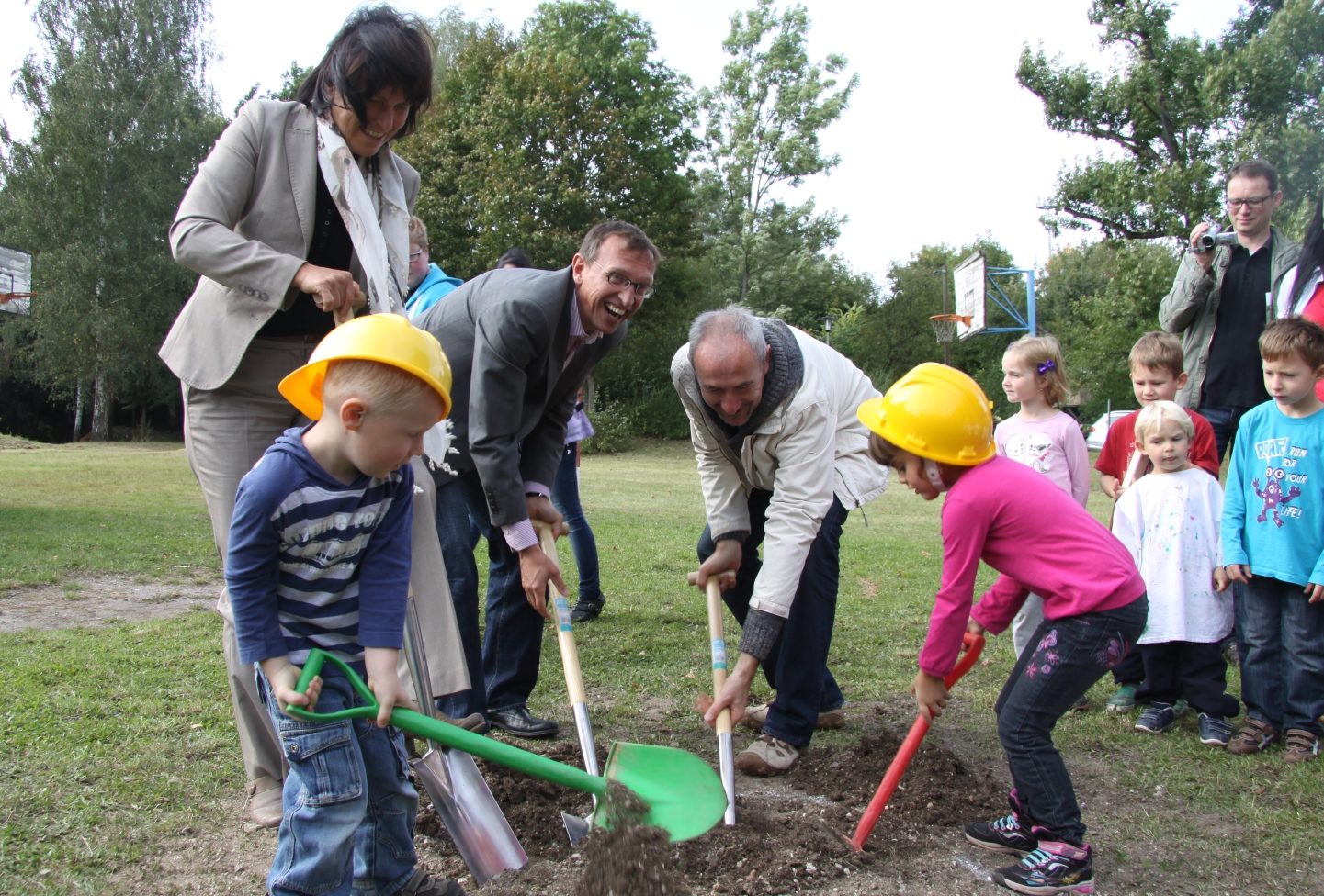 Kinder der Kita "Martin Hoop" konnten beim Spatenstich selbst Hand anlegen. "Unterstützt" wurden Sie von OB Pia Findeiß, Dr. Dietmar Meier (Geschäftsführer BFZ) und Stadtrat Friedrich Hähner-Springmühl.