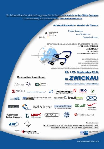 Ein neuer Jahreskongress der Automobilindustrie wirbt mit bekannten Themen: Zum Treffpunkt der Automotive-Branche am 26. und 27. September in Zwickau verständigen sich Hersteller und Zulieferer über globale Netzwerke, technische Innovationen und regionale Allianzen. Das 16. Jahr in Folge lädt die IHK Chemnitz Fachspezialisten, Wissenschaftler und Netzwerker aus dem In- und Ausland zu Information und Austausch ein. Schirmherr der Veranstaltung ist der Bundesminister für Wirtschaft und Technologie, Dr. Philipp Rösler. Partner sind das Automotive Cluster Ostdeutschland, die Sächsische Automobilinitiative AMZ, die Westsächsische Hochschule Zwickau und das Forschungs- und Transferzentrum e.V. Zwickau.