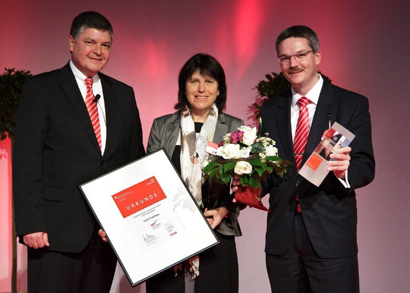 16. Unternehmer-Konvent im Kongresshotel Potsdam. Preisverleihung in der Kategorie Kommune des Jahres. V.l.n.r.: Wolfgang Zender, Verbandsgeschäftsführer Ostdeutscher Sparkassenverband, Dr. Pia Findeiß, Oberbürgermeisterin der Stadt Zwickau und Felix Angermann, stellvertretender Vorstandsvorsitzender der Sparkasse Zwickau. Copyright; Thomas Trutschel/photothek.net/Ostdeutscher Sparkassenverband