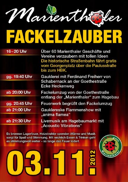 In gewohnter Weise erstrahlt am ersten Samstag im November der Stadtteil Marienthal zwischen 16 und 24 Uhr im Glanze zahlloser Lichter. Nach Veranstalterangaben werden viele Attraktionen dafür sorgen, dass auch die achte Auflage des Fackelzaubers ein Fest für die ganze Familie wird.