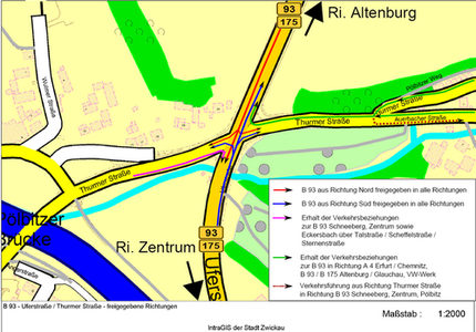 - aus Richtung Thurmer Straße wird der Verkehr in Fahrtrichtung B 93 / 175 - Zentrum, Schneeberg und Pölbitz geleitet: