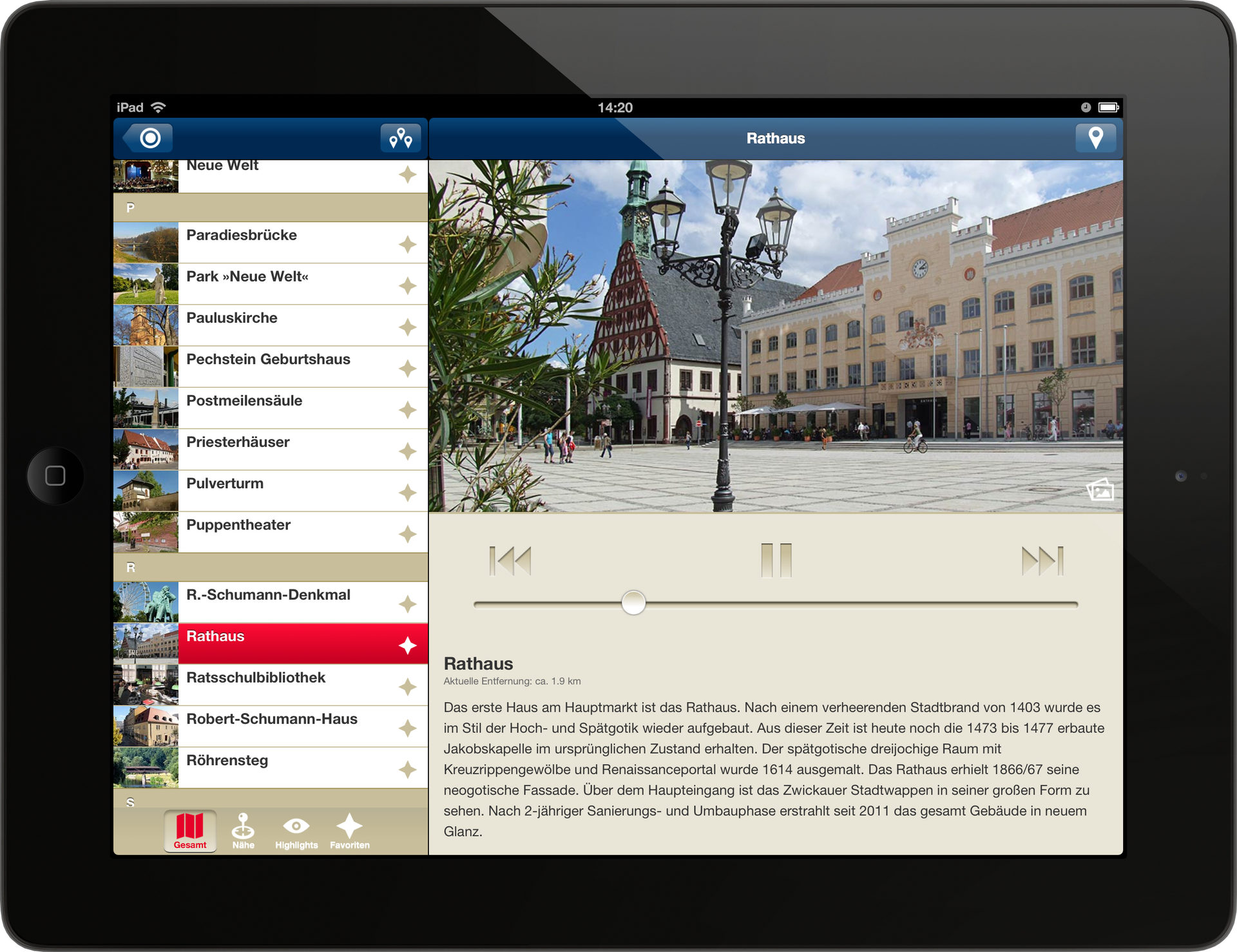 Die Zwickau-App steht von heute an im Apple Store und bei Google Play zum kostenlosen Download zur Verfügung. Ein entsprechender Link ist unter http://www.zwickau.de/ zu finden. Um die Datenmenge auf ca. 27 MB zu begrenzen, werden zunächst nur das Programm, die Texte und ein Bild pro Objekt geladen. Beim erstmaligen Aufrufen wird der Nutzer nach der Sprachversion gefragt, ob er die Ortungsfunktion nutzen möchte und ob er weitere Bild- und Audio-Dateien komplett herunterladen möchte oder nur im Bedarfsfall nutzen will. In Summe kommt die App auf etwa 60 MB. Dieser Download bietet sich beispielsweise an, wenn ein W-Lan zur Verfügung steht.