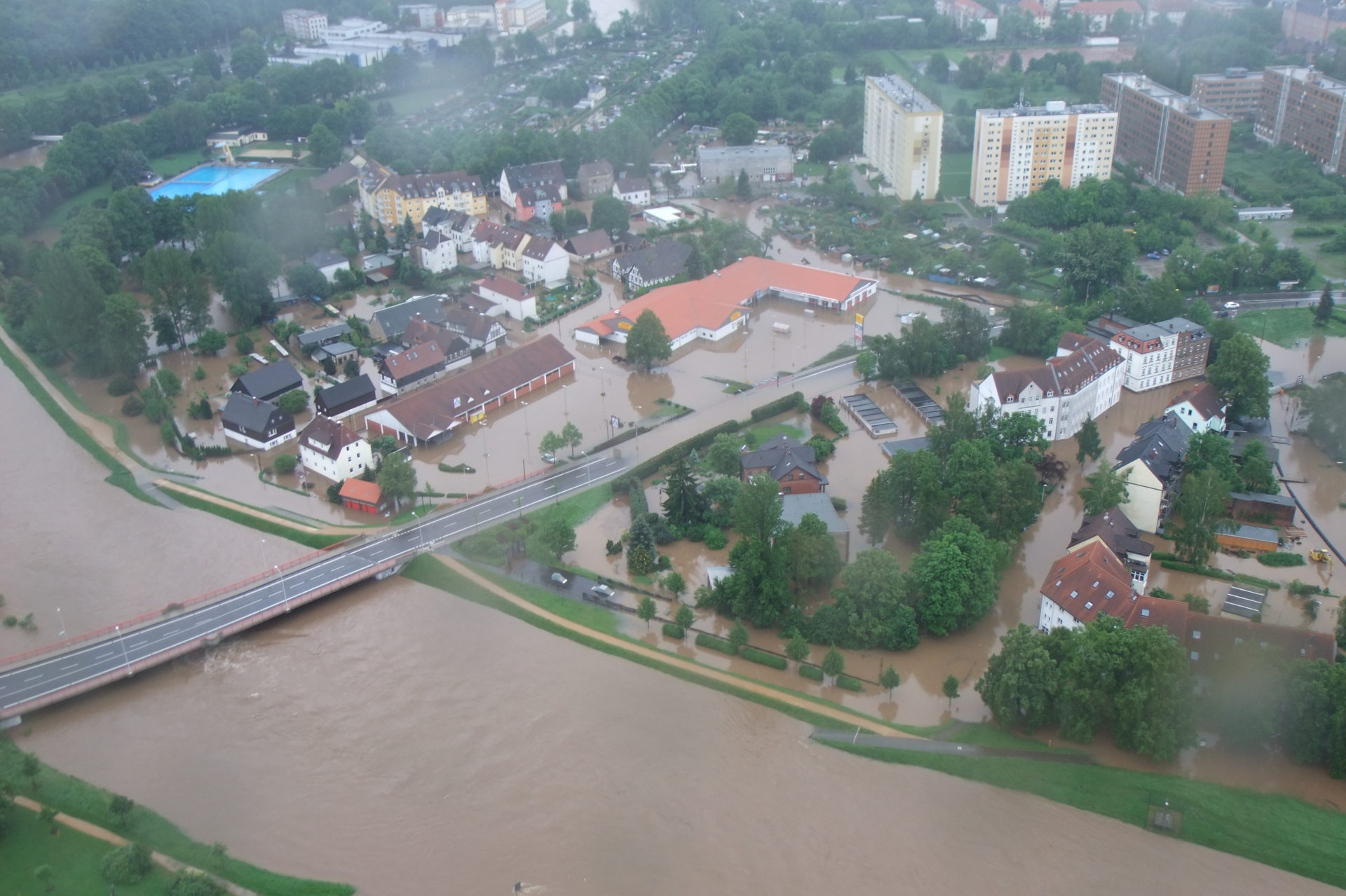 - 12.30 Uhr: Talsperre Eibenstock läuft über, Teile von Pölbitz stehen 0,5 m unter Wasser