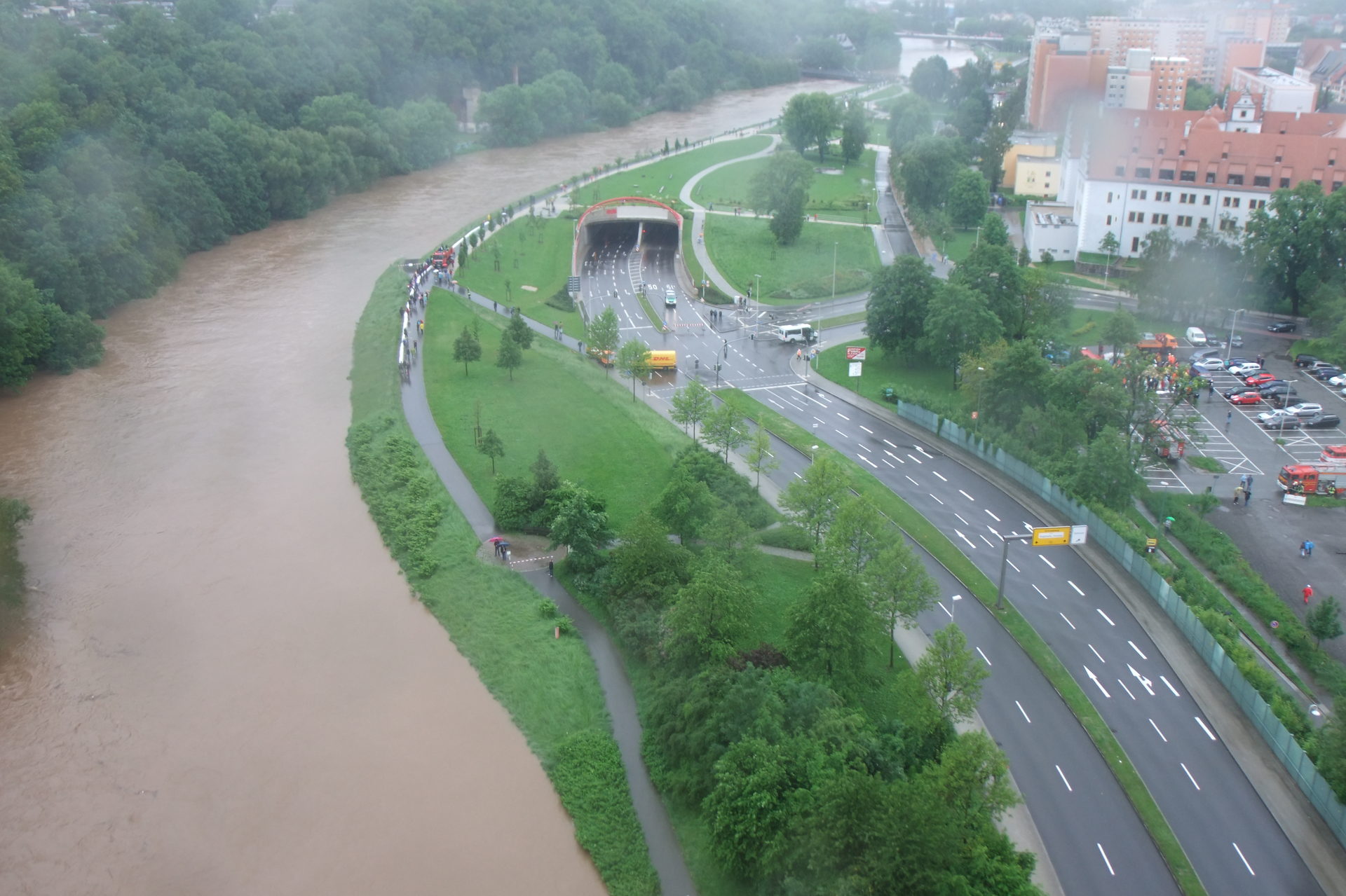 - 13 Uhr: Crossen: 20 cm über Straßenniveau, viele freiwillige Helfer im Einsatz, Klärwerk Crossen: Land unter; Pegel bis 465 cm steigend, Dammkrone Bereich „Neue Welt" wird überströmt, Sanitätszüge Kat-Schutz sind aktiviert