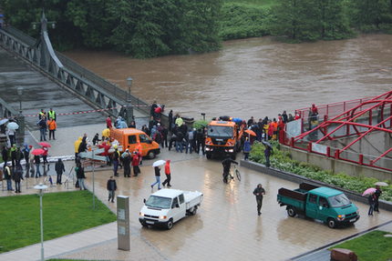 - 9.30 Uhr: Pölbitz, Wasserübertritt im Bereich „Neue Welt", Brückenstraße, Crossen Bereich Pappelkurve: Pegel steigt bedrohlich, Bevölkerung wird informiert