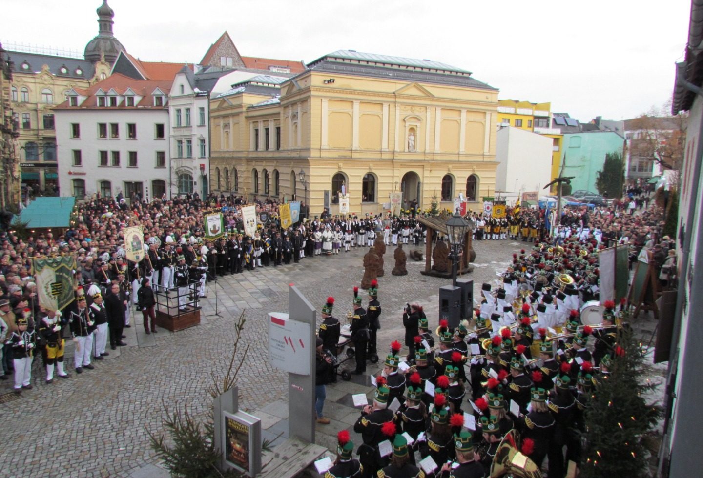 Getreu der bergmännischen Traditionspflege, findet in Zwickau in jedem Jahr die Bergparade der Uniformträger und Bergkapellen statt. Am kommenden Samstag, dem 14. Dezember, starten um 14 Uhr die Bergmänner ihren Marsch ab dem Glück-Auf-Center in Richtung Zwickauer Innenstadt. Den glanzvollen Abschluss bildet um 14:45 Uhr das Bergkonzert im Domhof vor den Priesterhäusern. Erwartet werden rund 380 Teilnehmer.