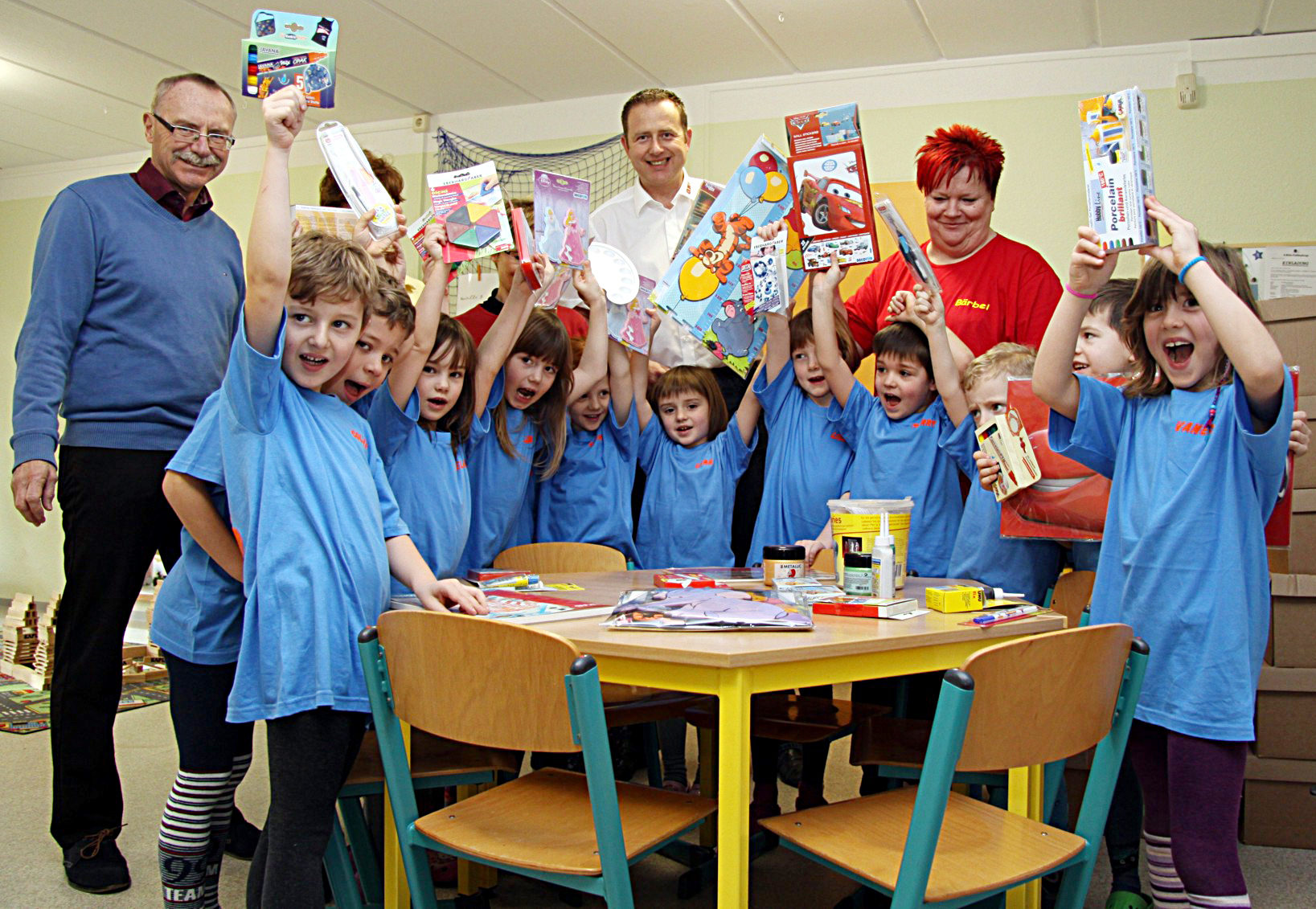 Uwe Findeiß, Leiter des Amtes für Schule, Soziales und Sport nahm das Material gemeinsam mit den Kindern und Erzieherinnen der Kita und stellvertretend für die anderen 16 Kitas entgegen. „Wir freuen uns riesig über die vielen tollen Sachen!" Und auch Bärbel Cser, Leiterin der „Schatzinsel" strahlte. „Wir werden unseren Teil im Rahmen des Projektes „Haus der kleinen Forscher" zum Experimentieren und Forschen einsetzen, freuen uns aber auch, unsere kreativen Angebote für die Kinder erweitern zu können."