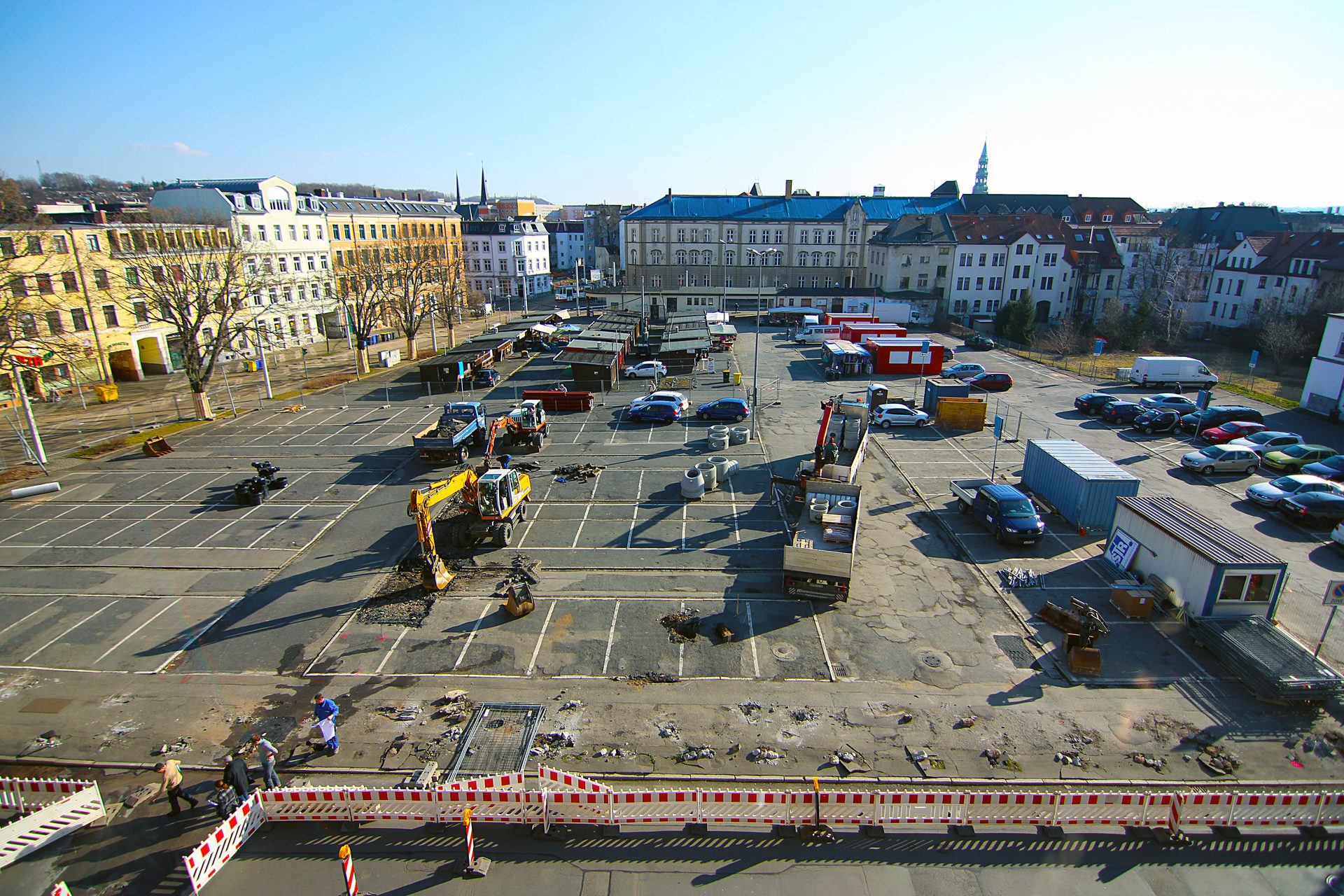 Am Montag, 24. Februar 2014 erfolgten mit der Baustelleneinrichtung erste Arbeiten zur Umgestaltung des Neumarktes.