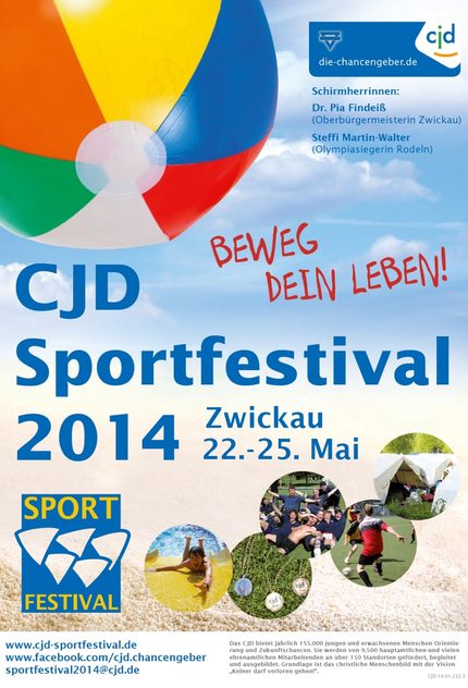 Am Freitag, 23. Mai, stehen Sportwettkämpfe in den klassischen Disziplinen Badminton, Beachvolleyball, Bogenschießen, Dart, Fußball, Leichtathletik, Streetbasketball, Schwimmen und Tischtennis auf dem Programm. Am Samstag, 24. Mai, startet dann am Hauptmarkt bzw. am Schwanenteich in Zwickau das Fun-Festival - mit Disziplinen wie beispielsweise Elefantenrennen im Großkanadier, Kampf der Gladiatoren, Gameshow, Bogenschießen, Streetbasketball sowie Unihoc, eine Art Hockey. Dabei wird auch ein besonderes Team, bestehend unter anderem aus CJD Vorstand Pfarrer Matthias Dargel sowie dem Schauspieler Jimi Blue Ochsenknecht, antreten.