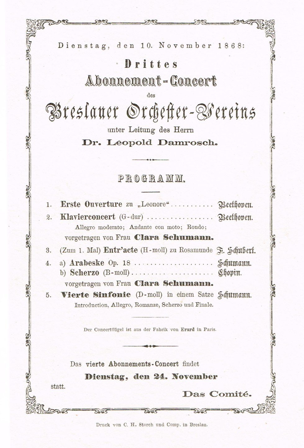Über das Konzert und vor allem den Auftritt von Clara Schumann heißt es in einem Korrespondentenbericht aus Breslau in der „Neuen Zeitschrift für Musik" vom 4. Dezember 1868: „Bereiteten schon die ersten Concerte des Breslauer Orchester-Vereins im October besondere Kunstgenüsse, so gewährte das dritte Concert dieses Vereins insofern ein erhöhtes Interesse, als daran Frau Clara Schumann mit rühmlichst bekannter Virtuosität sich betheiligte. Dieselbe spielte Beethovens Gdur-Concert und brachte den Charakter des Anmutigen und Heiteren, welcher in diesem Concert vorherrscht, durch ihre graziöse, vollendete Technik bekundende Spielweise, zugleich von poetischer Empfindung durchdrungen, zur schönsten Geltung; auch gewann das Ganze nicht minder durch die discret sich anschmiegende Orchesterbegleitung. War die Künstlerin schon bei ihrem Erscheinen von der überaus zahlreichen Zuhörerschaft mit lebhaftem Beifall empfangen worden, so verdoppelte sich jener nach dem Schluß jenes Concerts und wiederholte sich ebenso nach dem Vortrage der zarten Arabeske Op. 18 von R. Schumann und des Dmoll [richtig b-Moll]-Scherzos von Chopin."