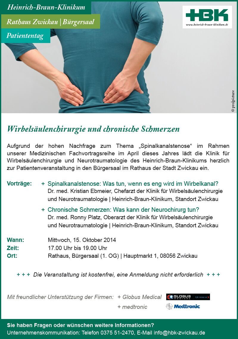 Die Klinik für Wirbelsäulenchirurgie und Neurotraumatologie des Heinrich-Braun-Klinikums (HBK) lädt am kommenden Mittwoch zu einem Patiententag zum Thema „Wirbelsäulenchirurgie und chronische Schmerzen" in das Rathaus ein. Anlass für die Veranstaltung ist die hohe Nachfrage bei einem Fachvortrag über Ursachen und Symptome sowie Diagnose- und Therapiemöglichkeiten eines engen Rückenmarkskanales, den im Frühjahr nach Angaben des HBK mehr als 200 Gäste besuchten. Die Patientenveranstaltung am 15. Oktober beginnt um 16.30 Uhr im Bürgersaal.