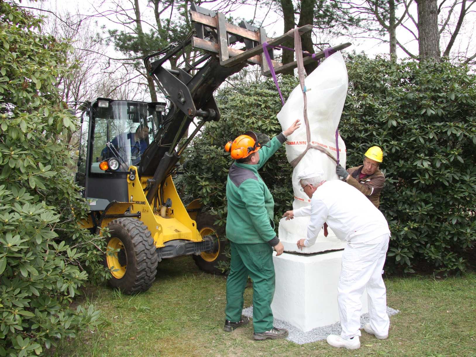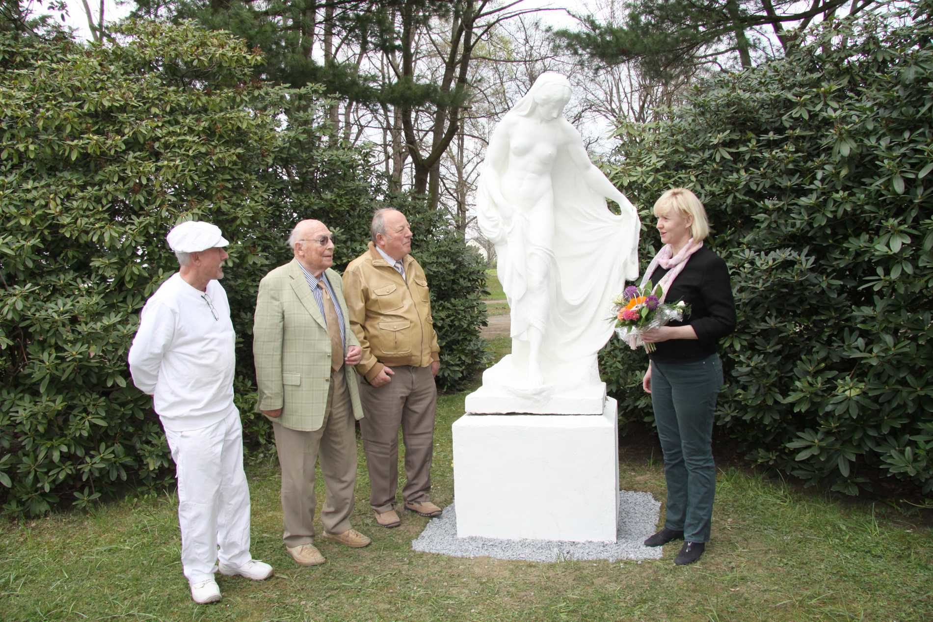 Heute war es endlich soweit: die Brunnennymphe aus dem Park „Neue Welt“ konnte nach einer im März erfolgten Restaurierung wieder an ihren angestammten Platz zurückkehren. Dem Termin wohnten am heutigen Mittag neben Dr. Jörg Voigtsberger, Leiter des Garten- und Friedhofsamtes und Kathrin Köhler, Bürgermeisterin Bauen auch die Enkel des Nymphen-Künstlers bei: Karl-Rudolf und Gerhard Mosebach aus Zwickau.
