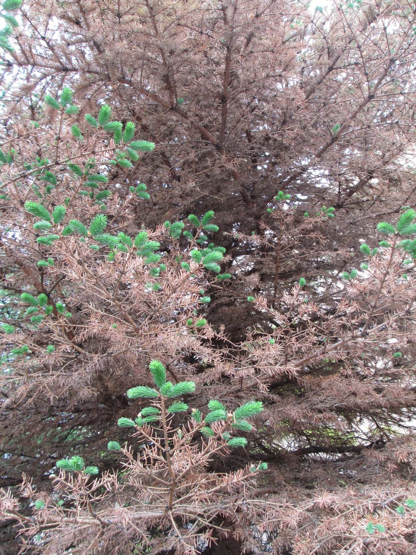 In letzter Zeit erreichen das Umweltbüro vermehrt Anrufe besorgter Bürger. Sie beklagen einen überaus großen Lausbefall an Nadelbäumen. An den betroffenen Bäumen, meistens Blaufichten, sind die Nadeln komplett braun gefärbt und fallen ab, sodass die Bäume richtig kahl aussehen.
