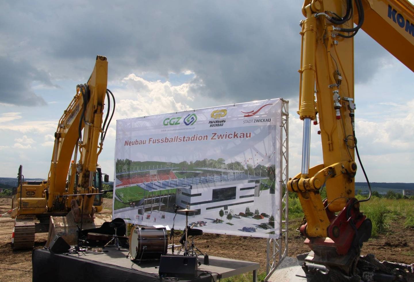 Am 6. Februar 2015 wurde für das Bauvorhaben, das rund 18 Millionen Euro netto kosten soll, der erste Spatenstich gesetzt. Einen der damals dafür verwendeten originalen Spaten übergab Freitag an den FSV Zwickau. Der Spaten soll versteigert werden, der Erlös kommt der Nachwuchsabteilung des FSV zugute. Bis August 2016 wird das neue Stadion im Stadtteil Eckersbach fertig gestellt, der Rohbau des Gebäudes soll Anfang 2016 komplett stehen. Allein für die Vorbereitung des künftigen Stadiongeländes werden ca. 70.000 m³ an Erdmassen bewegt, das entspricht rund 115.500 Tonnen.