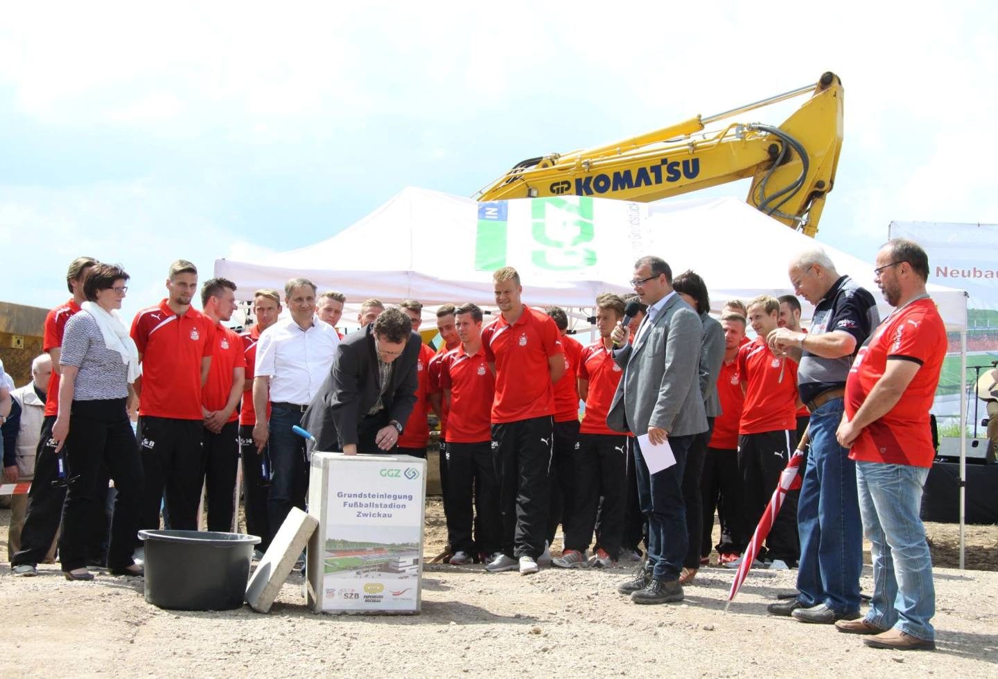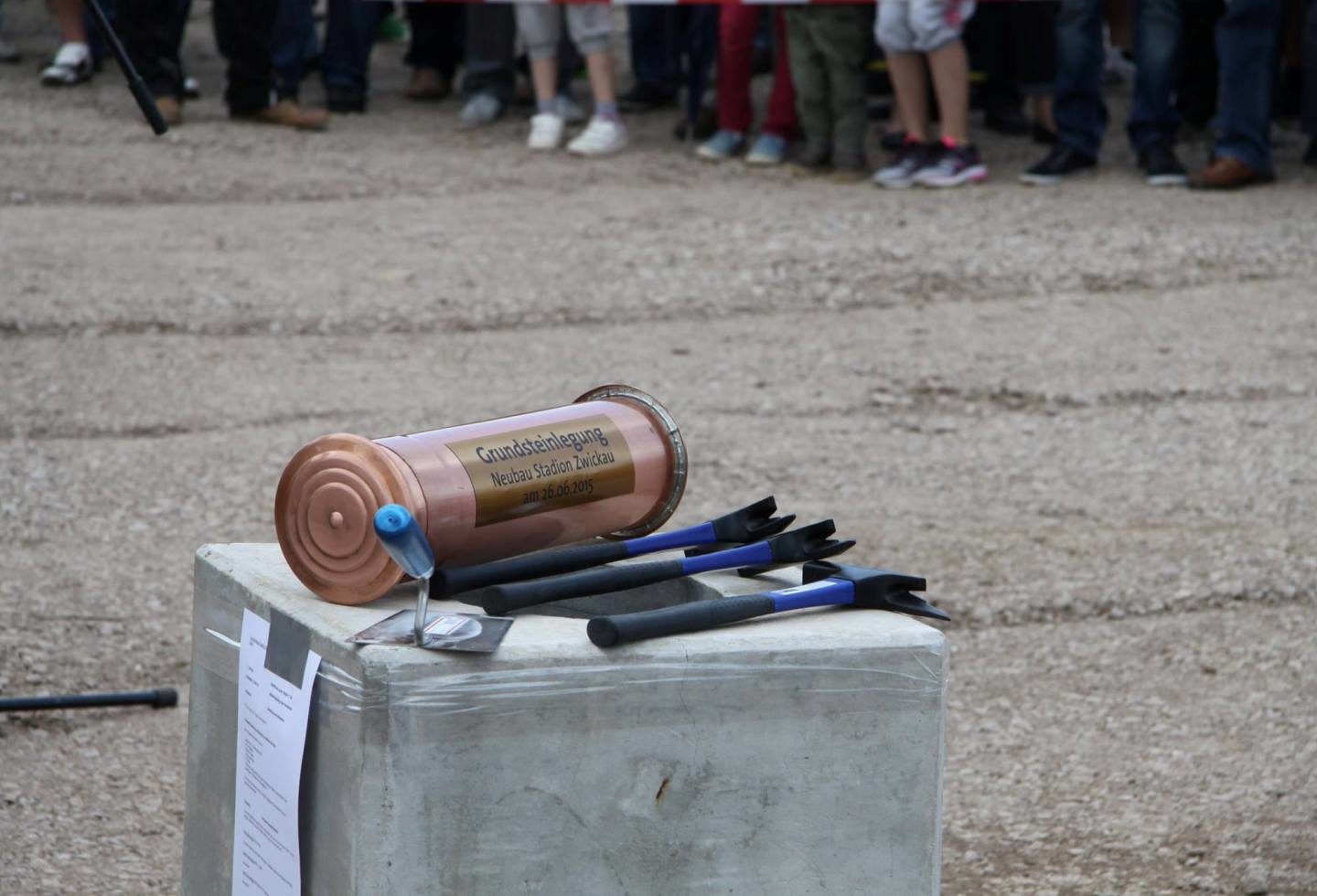 Vor rund 200 Fans wurde gestern der Grundstein für das neue Fußballstadion in Eckersbach gelegt. Den feierlichen Akt nahmen Oberbürgermeisterin Dr. Pia Findeiß, die Geschäftsführerin der Gebäude-und Grundstücksgesellschaft Zwickau mbH (GGZ), Maritta Freitag, und der Niederlassungsleiter der GP Papenburg Hochbau GmbH, Uwe Berger, vor. Die Zeitkapsel, die in den Stein eingelassen wurde, wurde mit Bauplänen, Münzen und den tagesaktuellen Zeitungen gefüllt. Hinzu kam neben Fanartikeln des FSV Zwickau und dem Protokoll der konstituierenden Sitzung des Aufsichtsrates der Stadion Zwickau Betriebs GmbH auch ein Datenträger mit Videomaterial vom Baugeschehen.