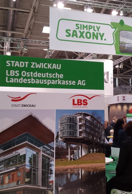 Unter dem Motto „Stadt. Land. Möglichkeiten." standen ausgewählte und architektonisch anspruchsvolle Investitionsprojekte in der Stadt und auf dem Land im Zentrum der sächsischen Messepräsentation. Zwickauer Projekte wie die Hochschulbibliothek und die Glück Auf Schwimmhalle konnten auf der großen LED-Wand bzw. dem Rundbanner den Besuchern präsentiert werden.