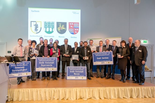 In diesem Jahr wurden neben den sächsischen eea-Kommunen (mit einem Erfüllungsgrad größer als 50 Prozent) auch die europäischen eea-Gold-Kommunen aus fünf Ländern (Erfüllungsgrad größer als 75 Prozent) gewürdigt. Die Auszeichnungen nahm Thomas Schmidt, Staatsminister für Umwelt und Landwirtschaft vor. Neben Zwickau, vertreten durch Oberbürgermeisterin Dr. Pia Findeiß und Mitgliedern des Energieteams Zwickau, wurden auch Hoyerswerda, Burkersdorf, Wurzen sowie Chemnitz und Delitzsch - letztgenannte mit dem Prädikat eea-Gold - ausgezeichnet.