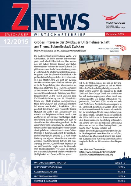Der Rückblick auf das diesjährige Wirtschaftsforum ist einer der Beiträge im neuesten Wirtschaftsbrief. Rund 170 Unternehmer trafen sich am 12. November im Rathaus, um über die „Zukunftsstadt Zwickau“ zu diskutieren. Weitere Themen der Ausgabe 12/2015 sind unter anderem das 25-jährge Jubiläum des Baustoffhandels Marienthal, die ZWIK 2015 sowie das erste Wirtschaftsbrunch oder das City-Forum zur Innenstadt. Außerdem informiert die städtische Wirtschaftsförderung zum neuen sächsischen Landesmesseprogramm, über ausgewählte Termine und zum IQ-Innovationspreis Mitteldeutschland.