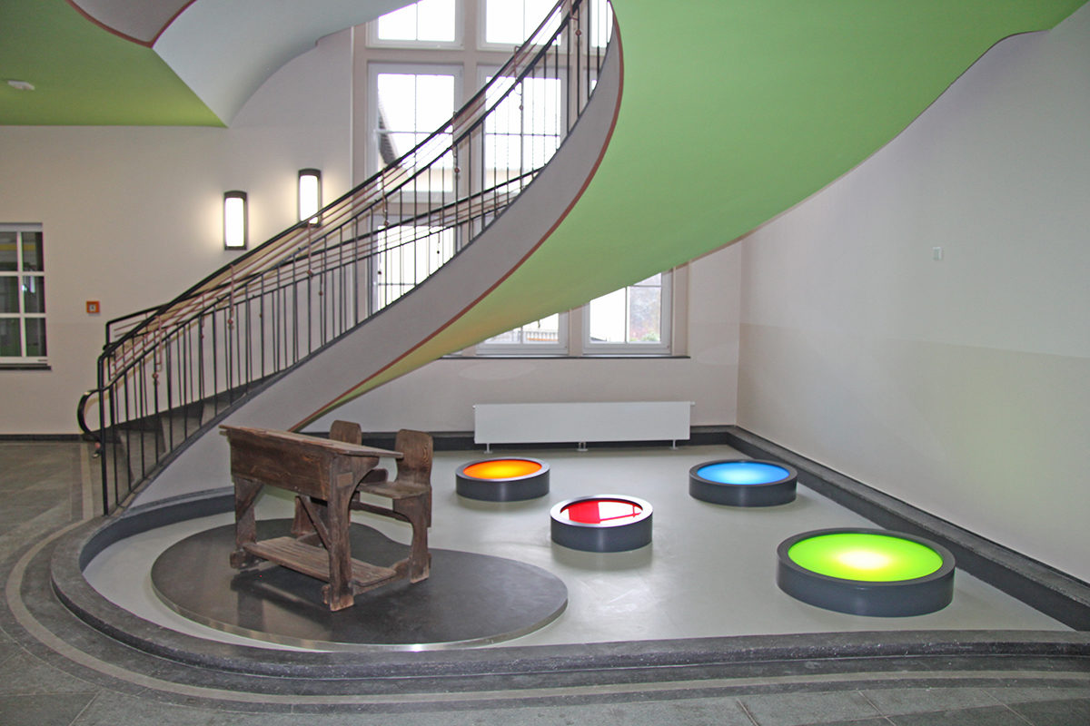 Viele Oberflächen wurden neu gestaltet und mit neuen Farben und Belägen versehen. Mit der besonderen Farbgestaltung erhielt jede Etage eine eigene Farbe. In den Außenanlagen wurde der obere Pausenhof komplett überarbeitet und erneuert. Darüber hinaus wurde ein hier auch ein sogenanntes „grünes Klassenzimmer“ eingeordnet.