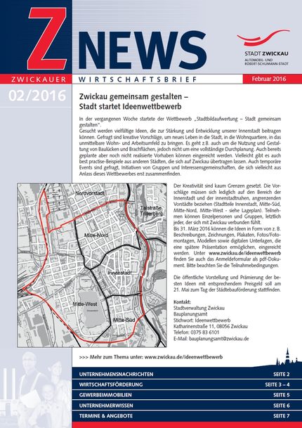 Die erste Ausgabe des Jahres 2016 macht unter anderem auf den Ideenwettbewerb zur Stadtbildgestaltung aufmerksam. Weitere Themen sind der Produktionsrekord bei VW Sachsen, die letzte Sitzung des „runden“ Tisches zur Innenstadtbelebung oder aktuelle Angebote von Gewerbeimmobilien. Breiten Raum nimmt der Ausbau des Breitbandnetzes ein. Hier wird sowohl über die Pläne der Telekom berichtet als auch über die Fördermittel, welche die Stadt Zwickau erhält.