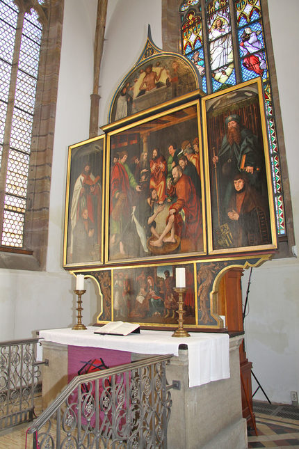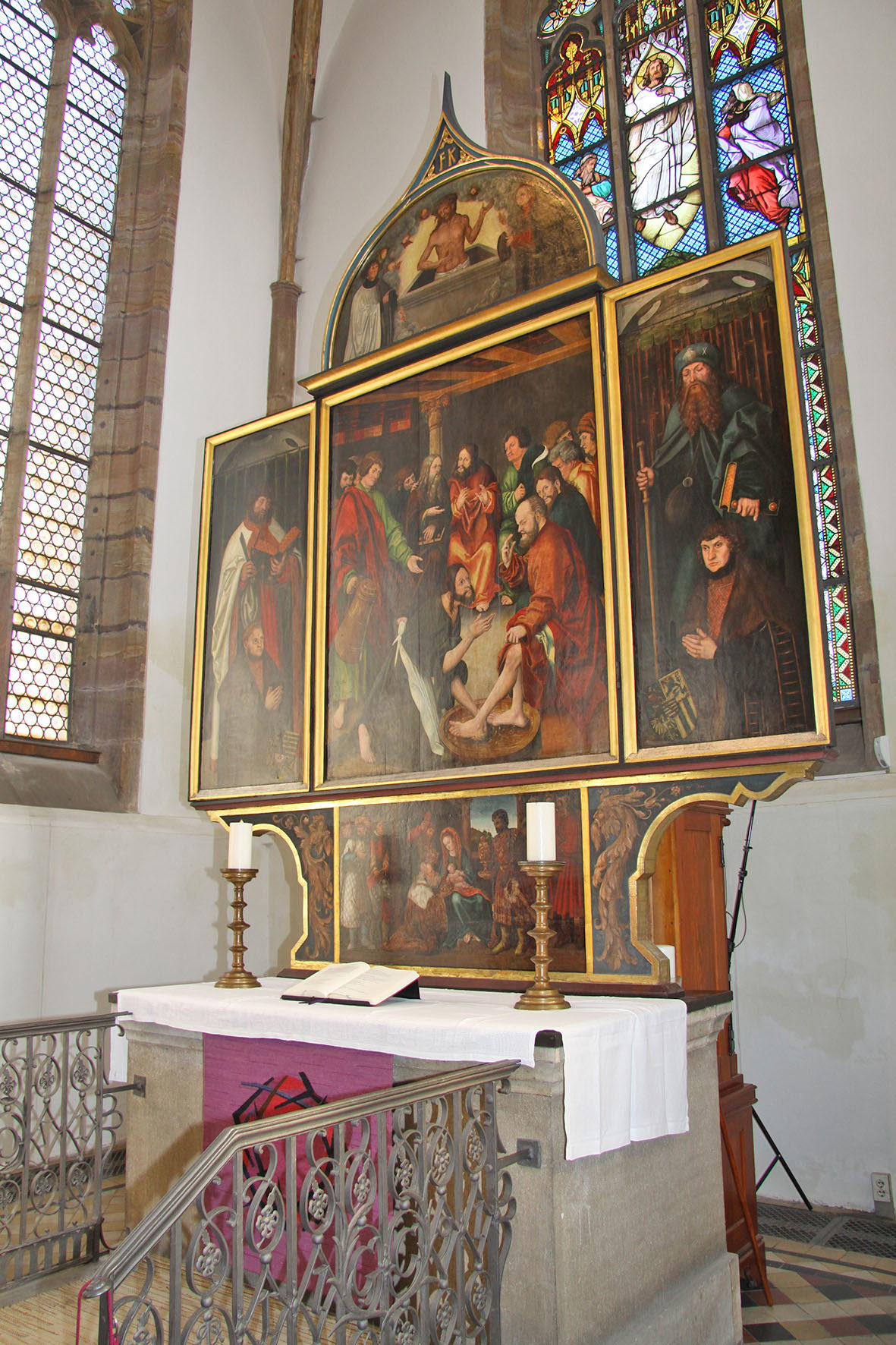 Der geöffnete Flügelaltar zeigt in der Mitte die „Fußwaschung Petri“, eine sehr selten dargestellte Szene aus dem Neuen Testament, und auf den Flügeln Kurfürst Friedrich den Weisen und Herzog Johann mit ihren Schutzpatronen. Die außerordentlich qualitätvollen Gemälde stammen aus der Werkstatt Lucas Cranachs d. Ä. und fanden in der Forschung lange Zeit wenig Beachtung.