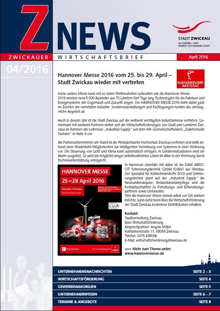 Die neue Ausgabe des Wirtschaftsbriefes ist online. In dem Newsletter, der alle zwei Monate erscheint, informiert das Büro für Wirtschaftsförderung über die Präsentation auf der Hannover Messe, die vom 25. bis 29. April stattfindet. Weitere Themen sind beispielsweise die Verleihung des German Design Awards für Ö-Konzept, das „Handlungskonzept Wirtschaft“ oder der Bundesverkehrswegeplan. In der Rubrik „Termine“ wird unter anderem auf die Lange Nacht der Technik am 22. April und den Zwickauer Sparkassen-Stadtlauf am 29. Mai hingewiesen.