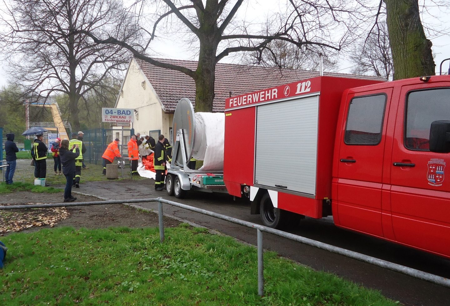 Zu Testzwecken wurde heute in Pölbitz der neue „Mobildeich“ aufgebaut. Um den Bereich  der Angerstraße im Hochwasserfall und dem möglichen Rückstau des Moritzbaches besser schützen zu können, nutzt Zwickau künftig dieses Schlauchwallsystem, für das die Stadt fast 79.000 Euro ausgab. Der Probeaufbau begann um 9 Uhr im Bereich des 04-Bades.