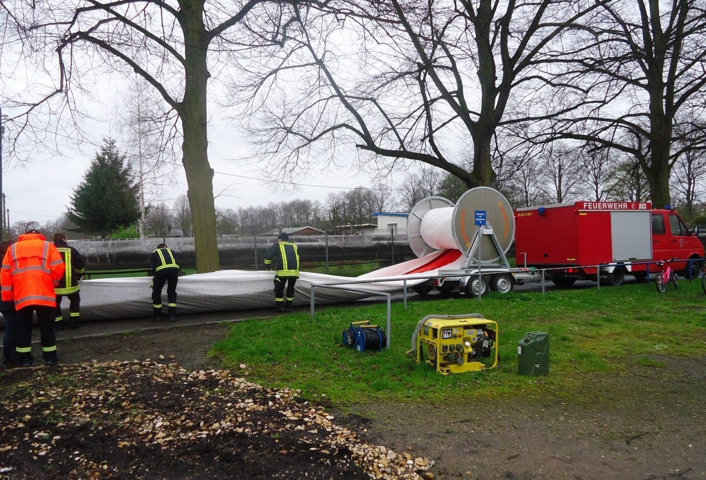 Am Probeaufbau beteiligt waren die Freiwilligen Feuerwehren Schneppendorf, Niederhohndorf und Mitte sowie Vertreter der Berufsfeuerwehr. Vor Ort war heute außerdem Dr. Ing. Walter Wagenhuber, der Geschäftsführer der Mobildeich GmbH aus Henstedt-Ulzburg, die das System liefert. Die Anschaffung des Systems erfolgte in Auswertung des Hochwassers 2013.