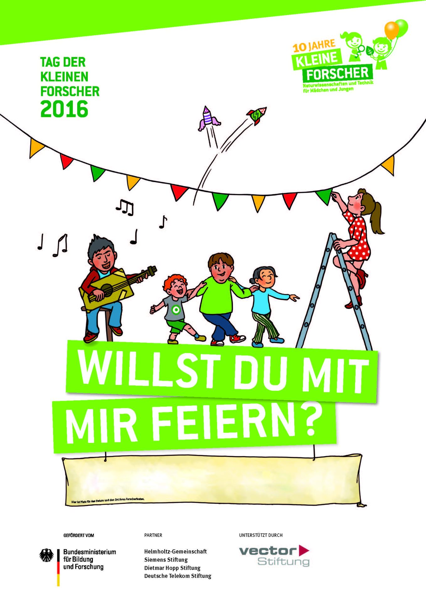 Am Dienstag, 21. Juni 2016 ist bundesweit „Tag der kleinen Forscher“ 2016. Dieser Tag ist nicht nur Höhepunkt eines Forscherjahrs, sondern in diesem Jahr auch ein Jubiläumstag - das „Haus der kleinen Forscher“ wird 10 Jahre alt! Grund genug, auch das Motto entsprechend anzupassen. „Willst Du mit mir feiern?“ heißt es, wenn deutschlandweit Mädchen und Jungen aus Kitas, Horten und Grundschulen auf Entdeckertour gehen und  forschen, wie viel Naturwissenschaften, Mathematik und Technik in einer richtigen Feier stecken.