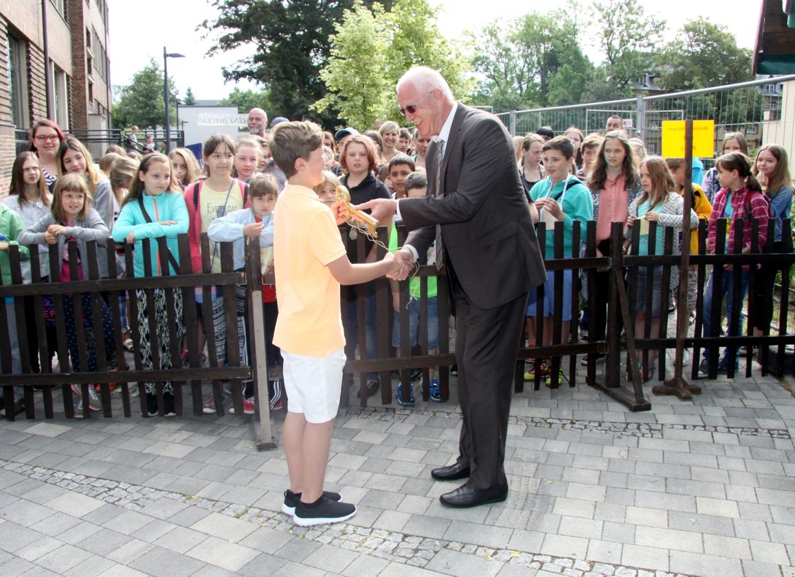 Bürgermeister Bernd Meyer übergibt Nico Silvio Blum (12) den großen Spielstadt-Schlüssel