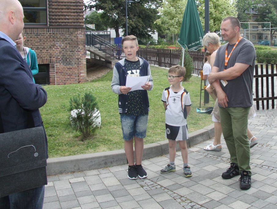 Gleich heute galt es für Nico als neues Stadtoberhaupt einen wichtigen Termin mit Gästen aus der Erwachsenenwelt wahrzunehmen – die Unterstützer der Spielstadt waren geladen. Nico begrüßte sie mit einer eigenen kleinen Rede und lud zu einem informativen Stadtrundgang mit hohem Schmunzel- und Unterhaltungswert ein. Abschließend gab es einen kleinen Mini-Zwickau-Imbiss mit Snacks aus der Bäckerei „Knusper“ und dem Gasthaus „Hexenkessel“.