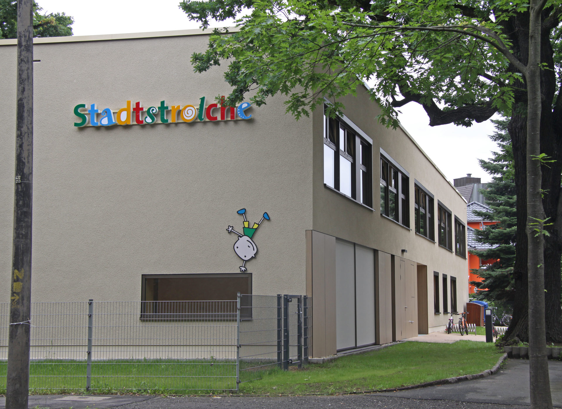 An der Humboldtstraße weist bereits ein großes Logo auf den neuen Hort „Stadtstrolche“ hin. Hier hat ein Zwickauer Designer gemeinsam mit der Hortleitung einen neuen – und vor allem beleuchteten - Schriftzug des Hortes und „kleine Strolche“ als Gestaltungselemente entwickelt.