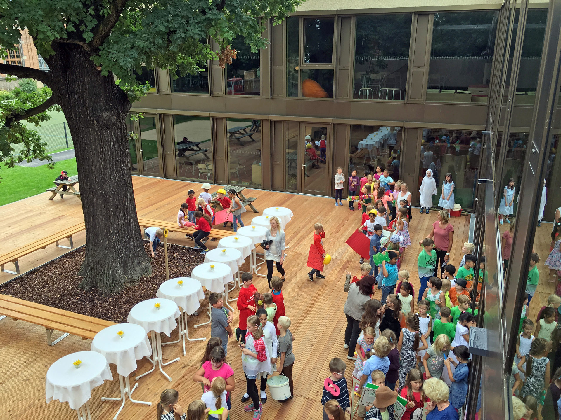 Schon beim Betreten des Gebäudes über den Haupteingang wird der aufmerksame Betrachter diesen zentralen Ort im Außenbereich einladend wahrnehmen.