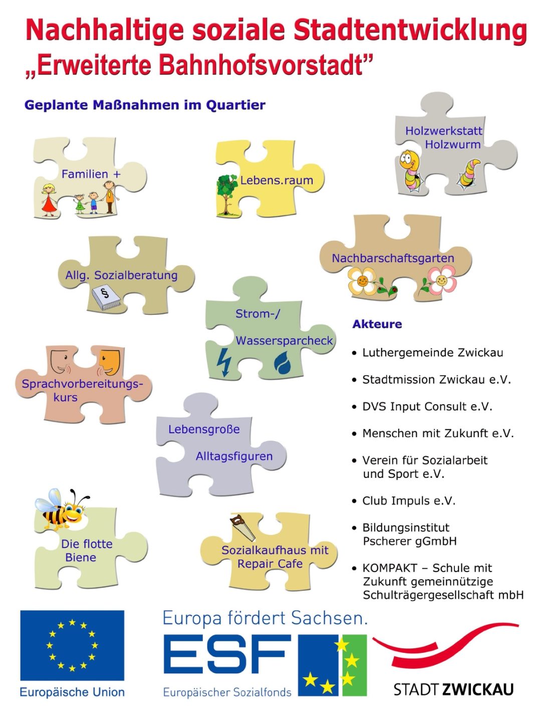 Mit der Auftaktveranstaltung wurden die Bürger der Bahnhofsvorstadt von Oberbürgermeisterin Dr. Pia Findeiß und dem Stadtplanungsamt über die künftig geplanten Maßnahmen informiert. In diesem Jahr sollen die Maßnahmen „lebens.raum“, „Holzwurm“ und die „Allgemeine Sozialberatung“ realisiert werden. Bei diesen Projekten handelt es sich um Maßnahmen sozialer Träger, welche sich an verschiedene Altergruppen richten.
