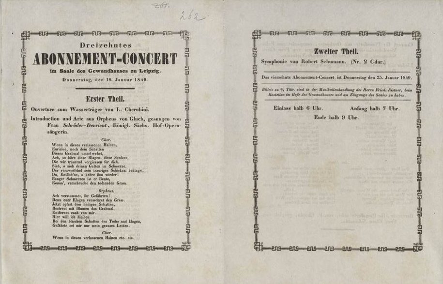 Das Konzert vom 18. Januar 1849 gehört zu den wenigen Konzerten, in denen der Komponist seine 2. Symphonie selbst dirigierte. Er litt in dieser Zeit wohl unter Stimmungsschwankungen und war mit dem Konzert und seiner Symphonie nicht zufrieden. Diesbezüglich vermerkte Clara Schumann in ihrem Tagebuch: „Robert ist immer noch recht unwohl, war unzufrieden mit sich, und meinte, er könne sich nicht denken, daß diese Symphonie jemand gefallen könne“.